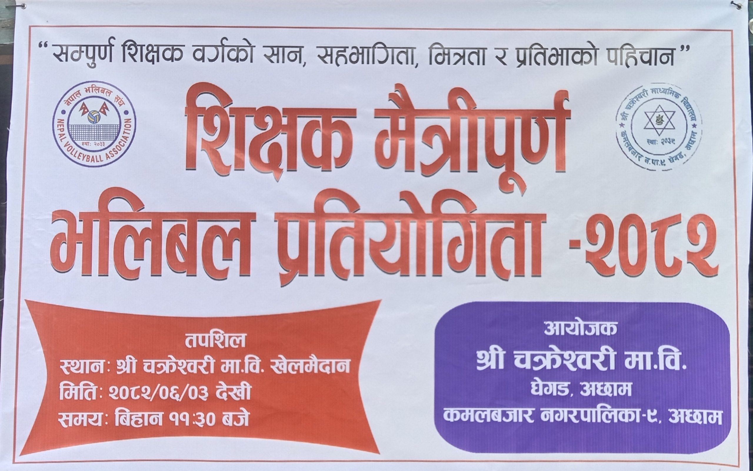 कमलबजार नगरपालिका ९ घेगडमा शिक्षक मैत्रीपुर्ण भलिबल प्रतियोगिता सुरु भएको छ । संबिधान दिवश तथा राष्टिय दिवसको अवसर पारी चक्रेश्वरी माध्यामिक बिधालयले प्रतियोगिताको आयोजना गरेको हो ।